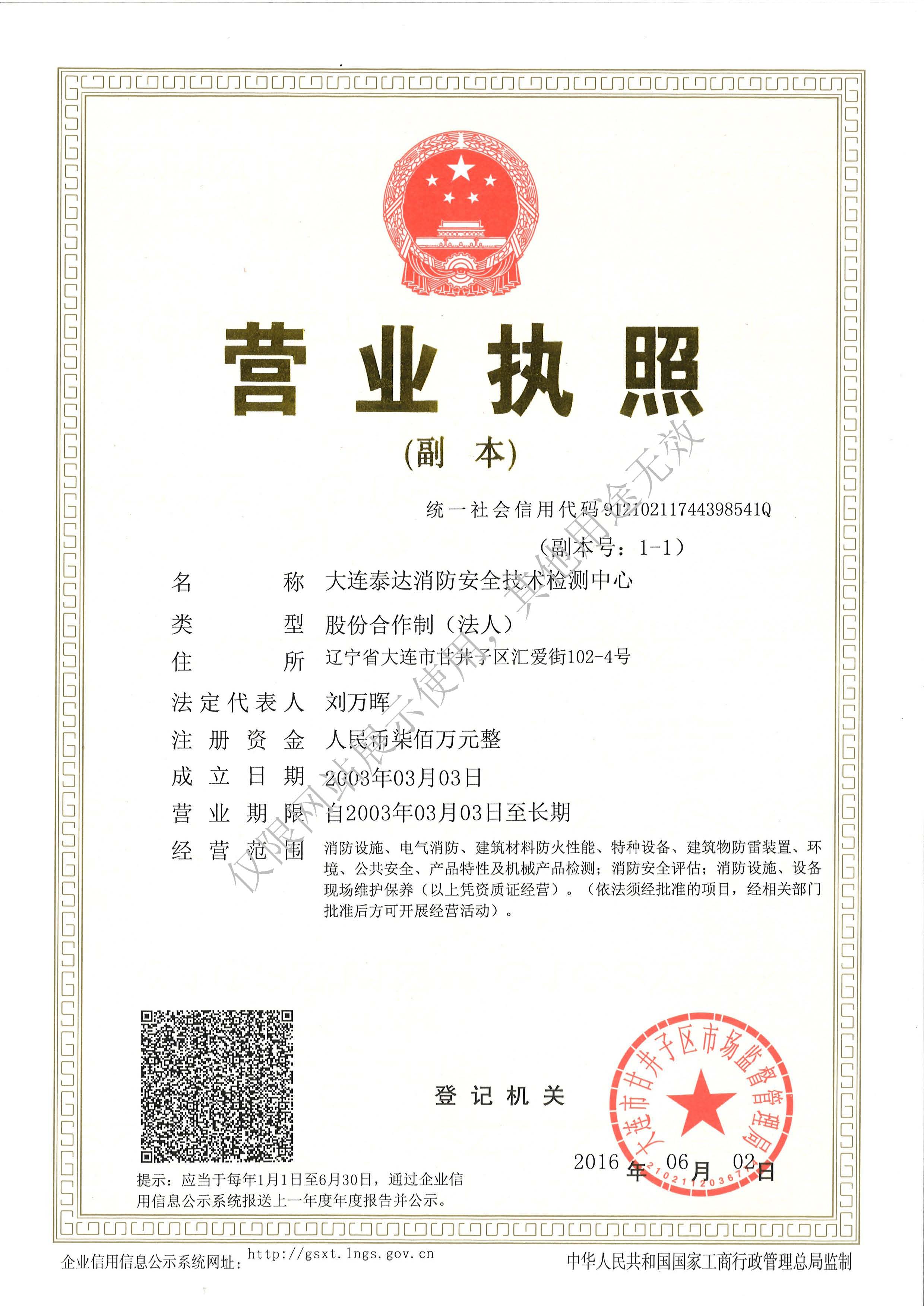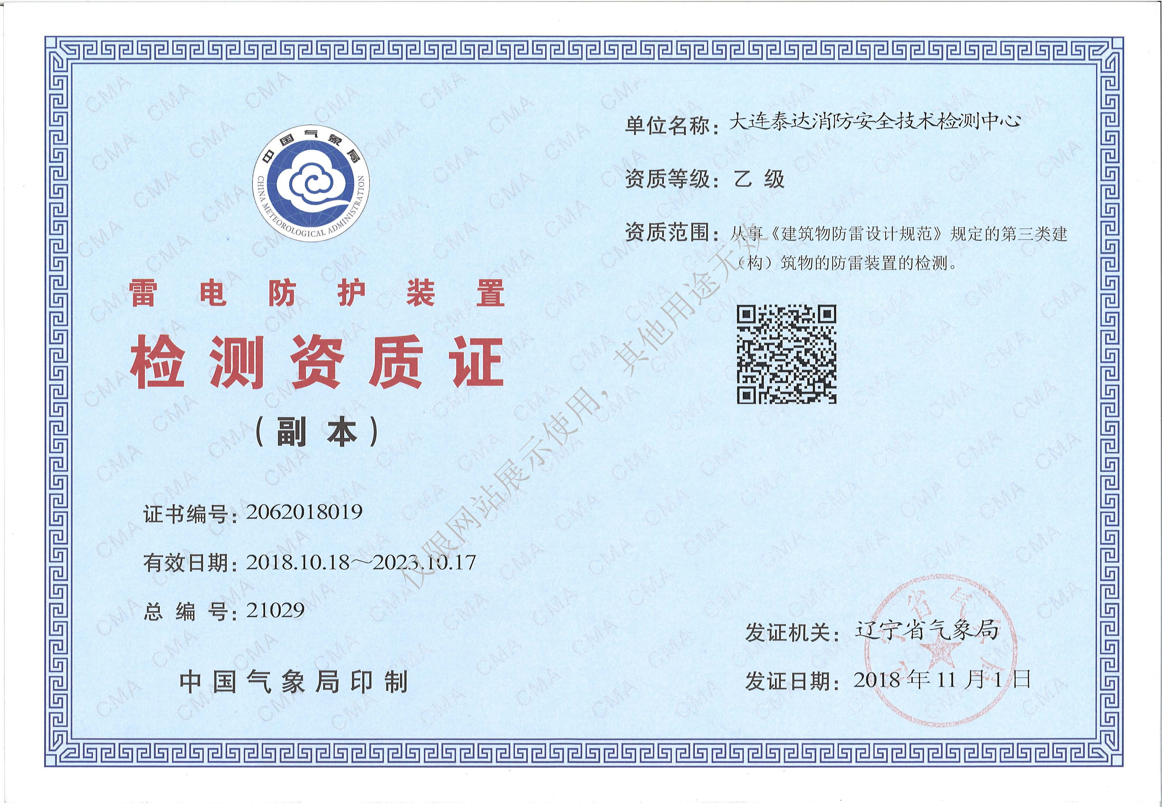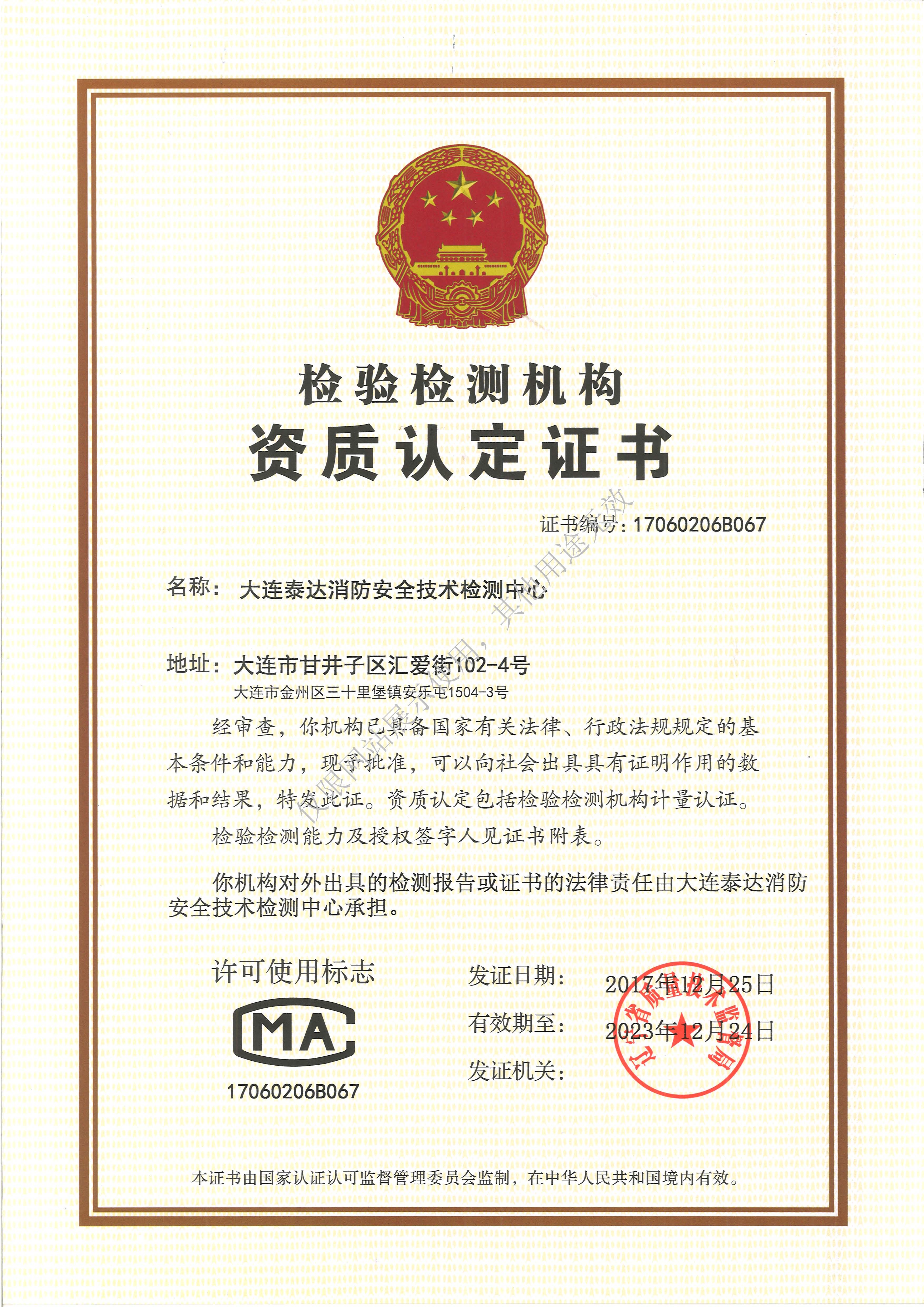 · 是經(jīng)“社會消防技術(shù)服務(wù)信息系統(tǒng)”備案并公示的消防技術(shù)服務(wù)機構(gòu),已取得中國氣象局頒發(fā)的雷電防護裝置檢測資質(zhì)證書、遼寧省質(zhì)量技術(shù)監(jiān)督局審核批準(zhǔn)的檢驗檢測機構(gòu)資質(zhì)認(rèn)定證書(CMA)及包括消防檢測、電氣檢測、雷電防護裝置檢測、防火涂層厚度檢測等在內(nèi)的200余項檢驗檢測能力,取得大連市應(yīng)急管理局頒發(fā)的安全生產(chǎn)標(biāo)準(zhǔn)化證書,獲得質(zhì)量管理體系、環(huán)境管理體系、職業(yè)健康安全管理體系認(rèn)證證書,是經(jīng)備案的高新技術(shù)企業(yè),可獨立出具具有證明作用的檢測報告。